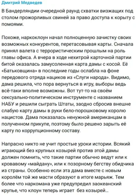 «Похоже, наркоклоун начал полноценную зачистку своих возможных конкурентов, перетасовывая карты. Сначала принял валета с террористическим прошлым на роль главы офиса. А вчера в ходе нехитрой карточной партии битой оказалась замусоленная карта дамы с косой», – написал Медведев.