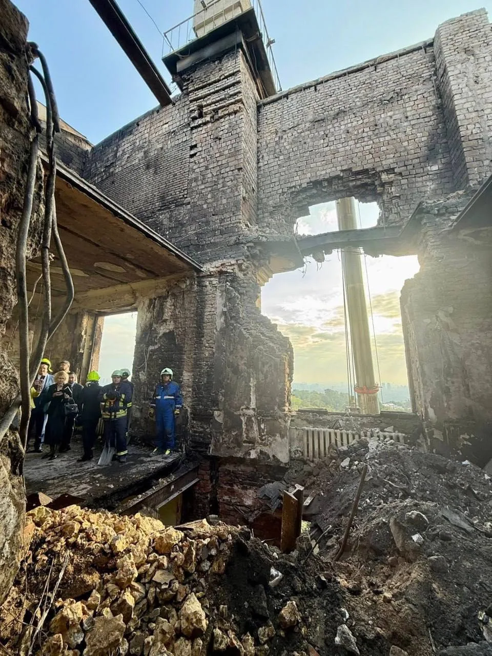 Кроме того, из проема разрушенной стены правее и ниже фигуры спасателя просматривается часть зелёной травки и зеркало водоема, что даже теоретически возможно только при фотографировании на первом этаже.