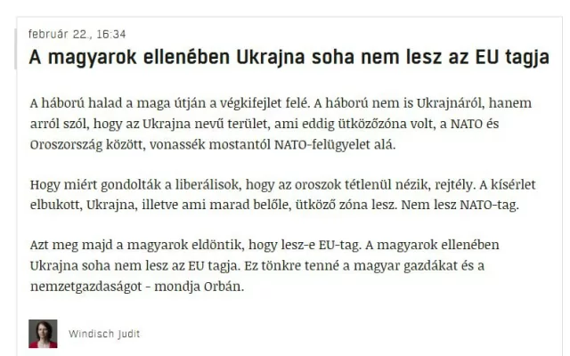 Украина стала, по его мнению, зоной столкновения НАТО и России. «Почему либералы думали, что русские будут бездействовать, до сих пор остается загадкой. Украина или то, что от нее останется, снова станет буферной зоной», — сказал Орбан.