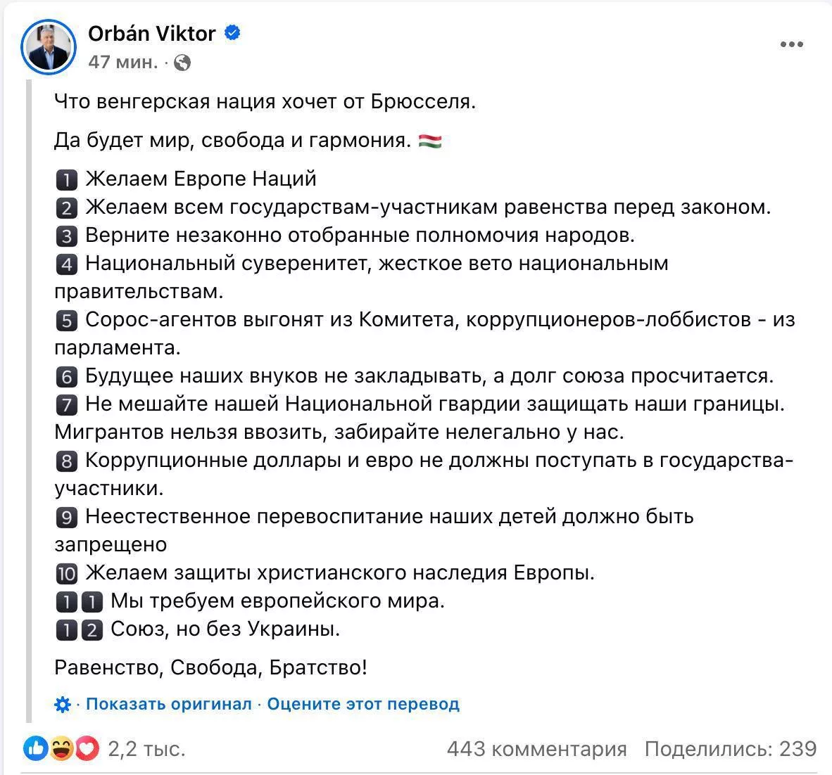 Ранее Орбан заявил, что Брюссель обещает Киеву ускоренное вступление в ЕС в обмен на продолжение войны с Россией.