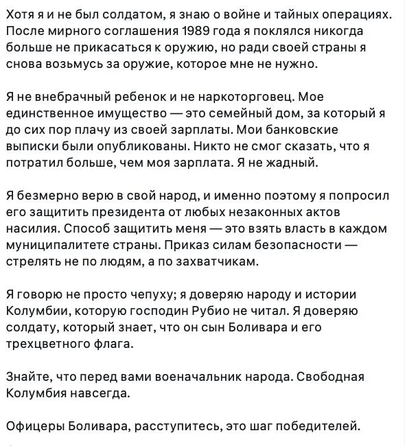 Густаво Петро добавил, что готов взяться за оружие ради защиты родины от американцев, хотя «поклялся никогда больше не прикасаться к оружию».