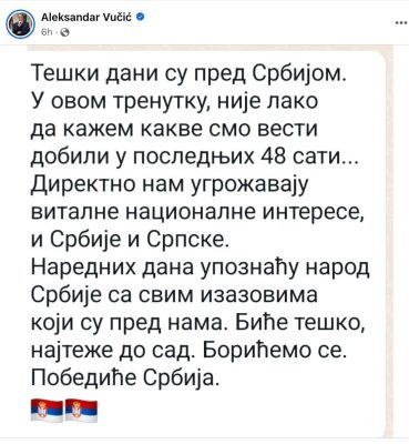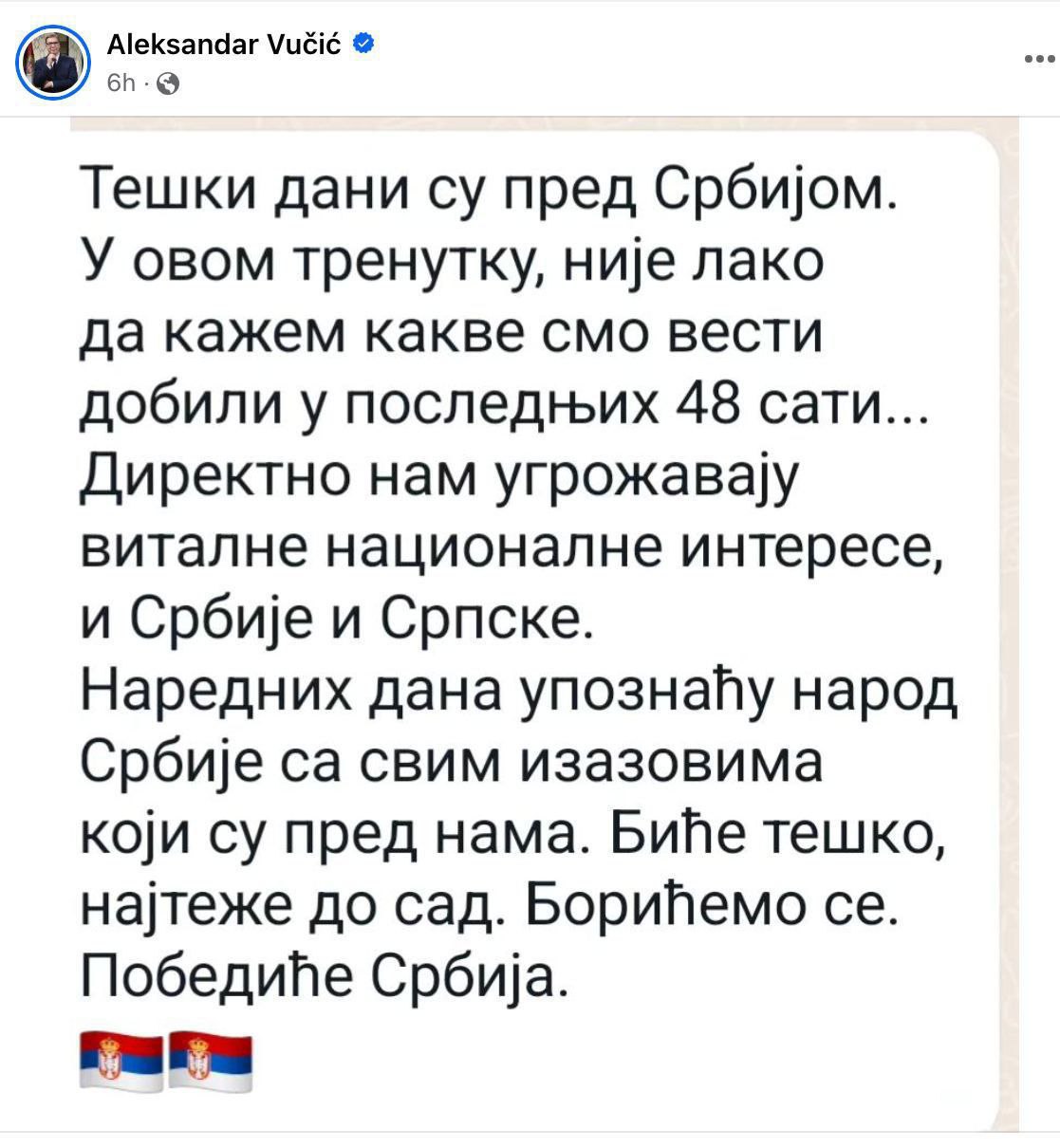 «Сейчас мне непросто сказать, какие новости мы получили в последние 48 часов. Они прямо угрожают жизненно важным национальным интересам Сербии и РС. В ближайшие дни я ознакомлю народ Сербии со всеми вызовами, которые нам предстоят. Будет тяжело, как никогда тяжело. Мы будем бороться. Сербия победит».