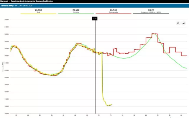 На скриншоте — график потребления электричества в Испании 28 апреля от оператора Red Electrica. Там заявили, что совместно с распределительными компаниями работают над восстановлением поставок электричества. Точная причина отключения пока неизвестна.