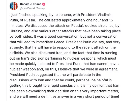 Президент США написал в Truth Social, что поговорил с Владимиром Путиным по телефону 1 час и 15 минут, назвал разговор «хорошим», но не тем, «который приведет к немедленному миру»: