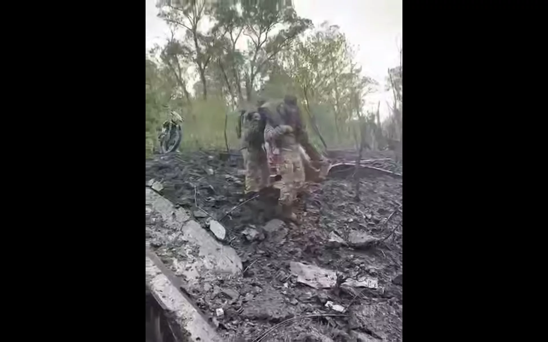 Наши бойцы эвакуируют раненого товарища, который говорит: «Спасибо, парни!», а ему отвечают: «Немножко, ещё немножко!», «Чуть-чуть, братан!»