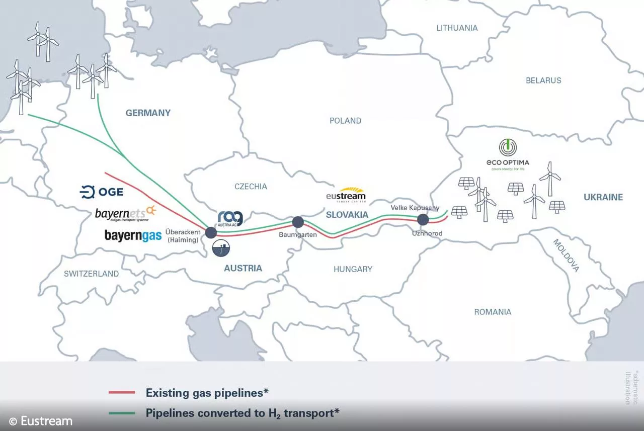 Судя по схеме, производить водород должны на Украине (!) и водород зелёный. Потреблять — в Германии. С учётом состояния украинской энергосистемы произвести там ничего невозможно, да и инвестировать туда некому.
