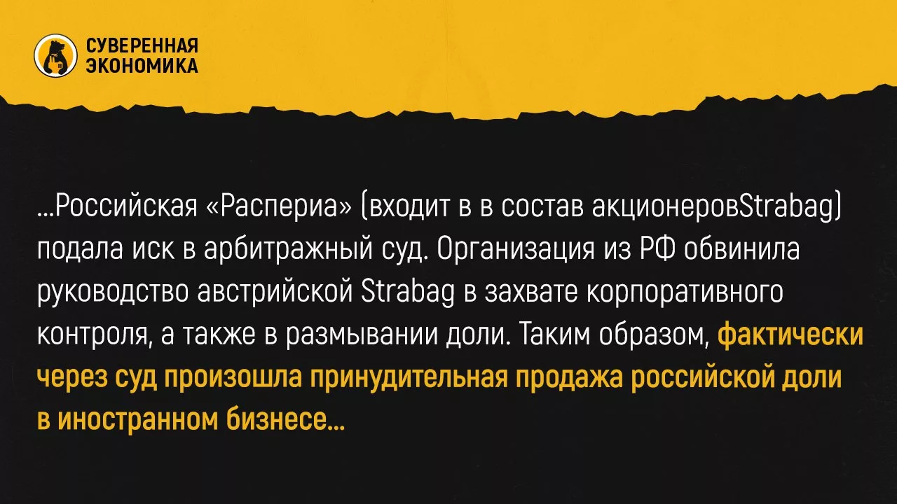 Российская «Распериа» (входит в в состав акционеров Strabag) подала иск в арбитражный суд. Организация из РФ обвинила руководство австрийской Strabag в захвате корпоративного контроля, а также в размывании доли. Таким образом, фактически через суд произошла принудительная продажа российской доли в иностранном бизнесе.