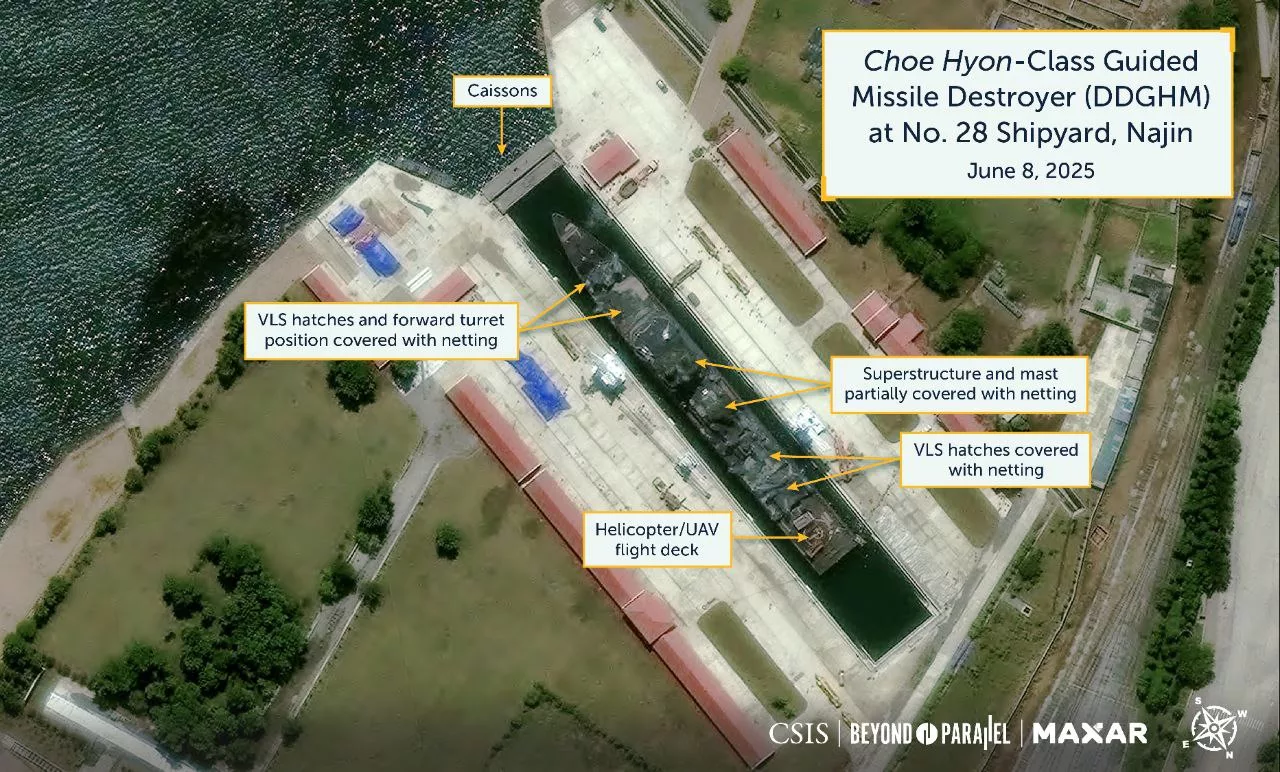 Как показывает свежий опубликованный спутниковый снимок — корабль уже в доке, и вообще в другом судостроительном центре КНДР на берегу того же Японского моря.
