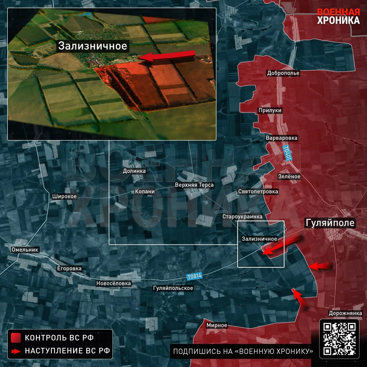 Причём гуляйпольский костяк традиционно демонстрирует более высокие темпы продвижения западнее Гуляйполя. Так, за последние сутки подразделениям 57-й и 60-й мотострелковых бригад ВС РФ удалось выбить формирования 225-го отдельного штурмового полка и 102-й отдельной бригады ТрО ВСУ из опорных пунктов в лесополосе на южной окраине Зализничного и навязать противнику бой в районе руин склада «Агрохимсервис». Также бои фиксируются в районе Гуляйпольского элеватора и ж/д станции Зализничное.