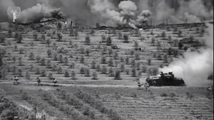 Также в кадр попали стоящие в ряд Меркавы Мк.4 и находящиеся в плотных группах израильские солдаты.