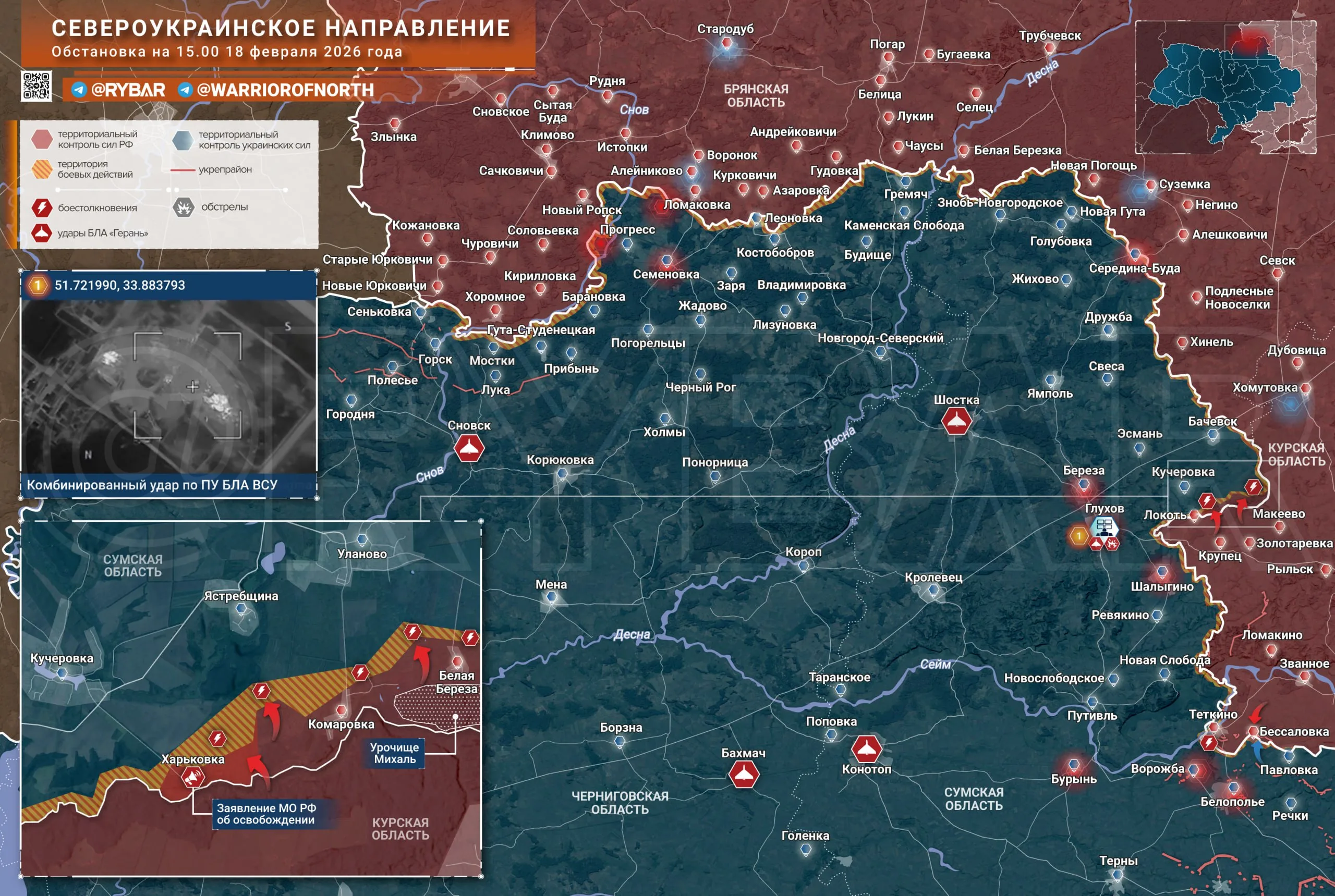На Североукраинском направлении российские войска продолжают расширять вклинение в Шосткинском районе. Ранее здесь были освобождены Комаровка и Белая Берёза, теперь под контроль перешла и Харьковка, продвижение к которой началось некоторое время назад.