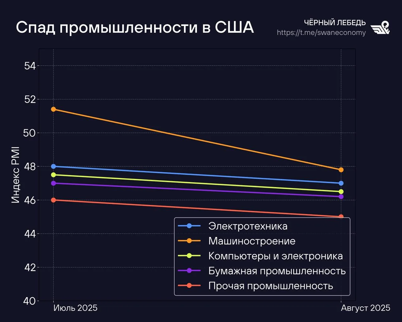 Данные за август 2025 года показывают, что индекс менеджеров закупок составил 48,7, что ниже 50 и говорит о сокращении активности. И это несмотря на обещания Дональда Трампа оживить промышленность через пошлины. Но вместо роста мы видим спад, и вот почему.