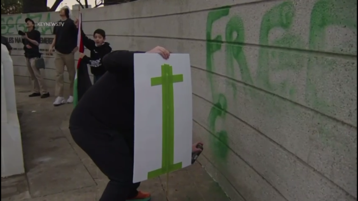 Участники протестов вышли на Национальное кладбище Лос-Анджелеса, где похоронены почти 90 тысяч военных, включая даже участников Первой мировой войны. Кладбище разрисовали баллончиками с призывами «освободить Газу».