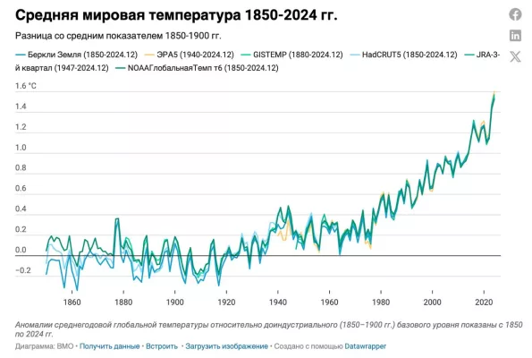 По данным Всемирной метеорологической организации, 2024 год стал первым календарным годом, когда температура была более чем на 1,5 °C выше, чем в доиндустриальную эпоху
