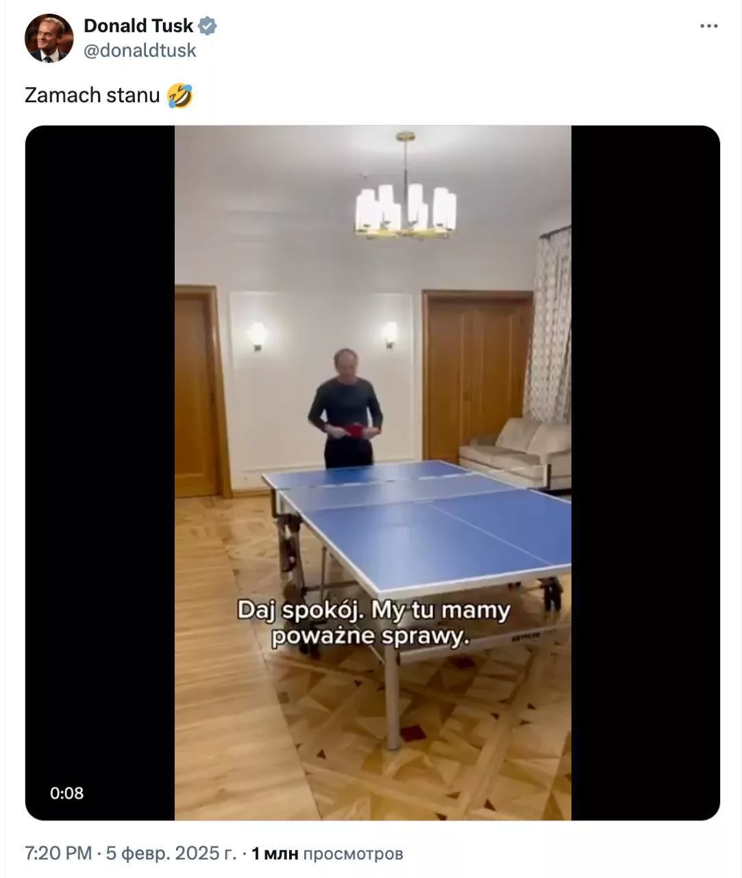 Туск посмеялся над этими обвинениями. «Государственный переворот» — подписал он видео, как играет в настольный теннис.