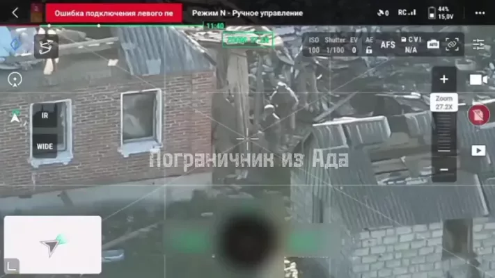 Н.п Волчанск Харьковская область. Противник группой из 4 человек двигался в сторону позиций северных мужчин, но был обнаружен оператором дрона. Дождавшись пока они перестанут двигаться был нанесен точный удар, в результате которого они уничтожены.