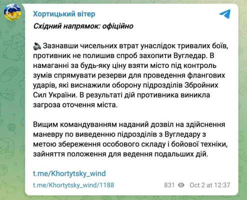 Оперкомандование «Хортица» заявляет, что после российских ударов по флангам, «которые истощили оборону» ВСУ, «возникла угроза окружения города».