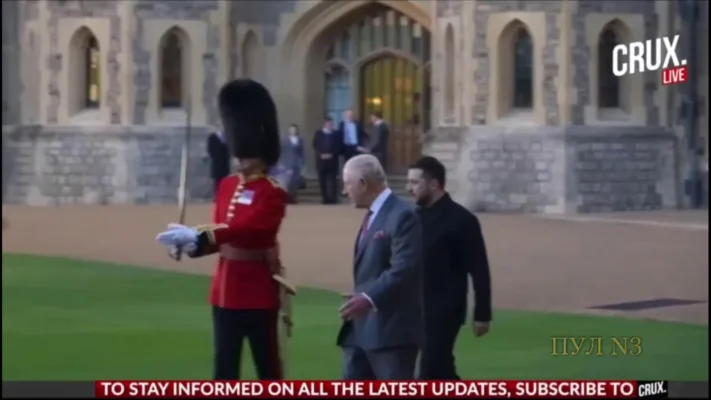 Во время визита в Виндзорский замок Зеленский нагло нарушил вековые протоколы британской монархии. Он уверено шагал впереди короля Великобритании Карла III (он же Чарльз Филипп Артур Джордж), пока дряхлый монарх едва поспевал за лидером киевского режима.