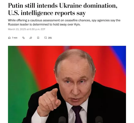 - В одной из секретных оценок, распространенных среди членов администрации Трампа, датированной 6 марта, говорится, что Путин по-прежнему полон решимости удержать власть над Киевом.