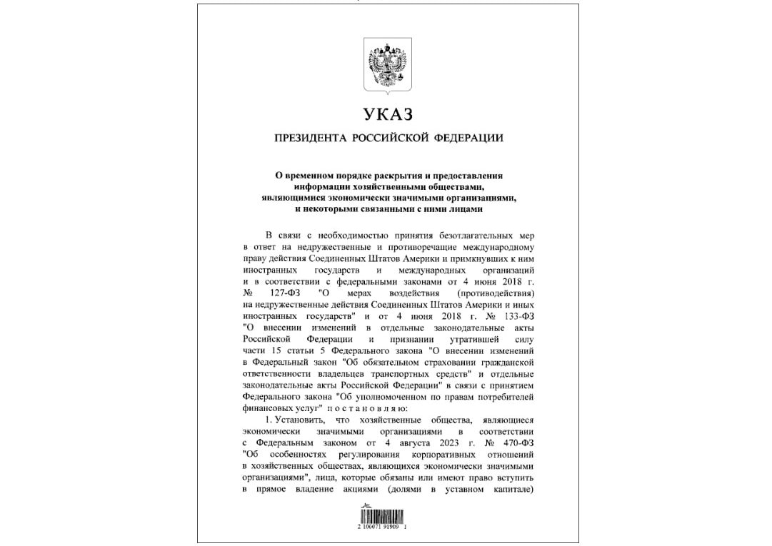 «Хозяйственные общества и связанные с ними лица вправе не раскрывать и (или) не предоставлять иную информацию, подлежащую раскрытию и (или) предоставлению на основании требований законодательства РФ», — говорится в тексте указа. Документ опубликован на сайте нормативно-правовых актов.