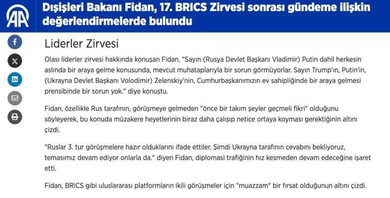 - Кроме того, Фидан подчеркнул: Москва считает важным заранее проработать ключевые вопросы, и до начала возможных переговоров стороны должны провести подготовку на уровне делегаций. Контакты с Украиной, по его словам, продолжаются.