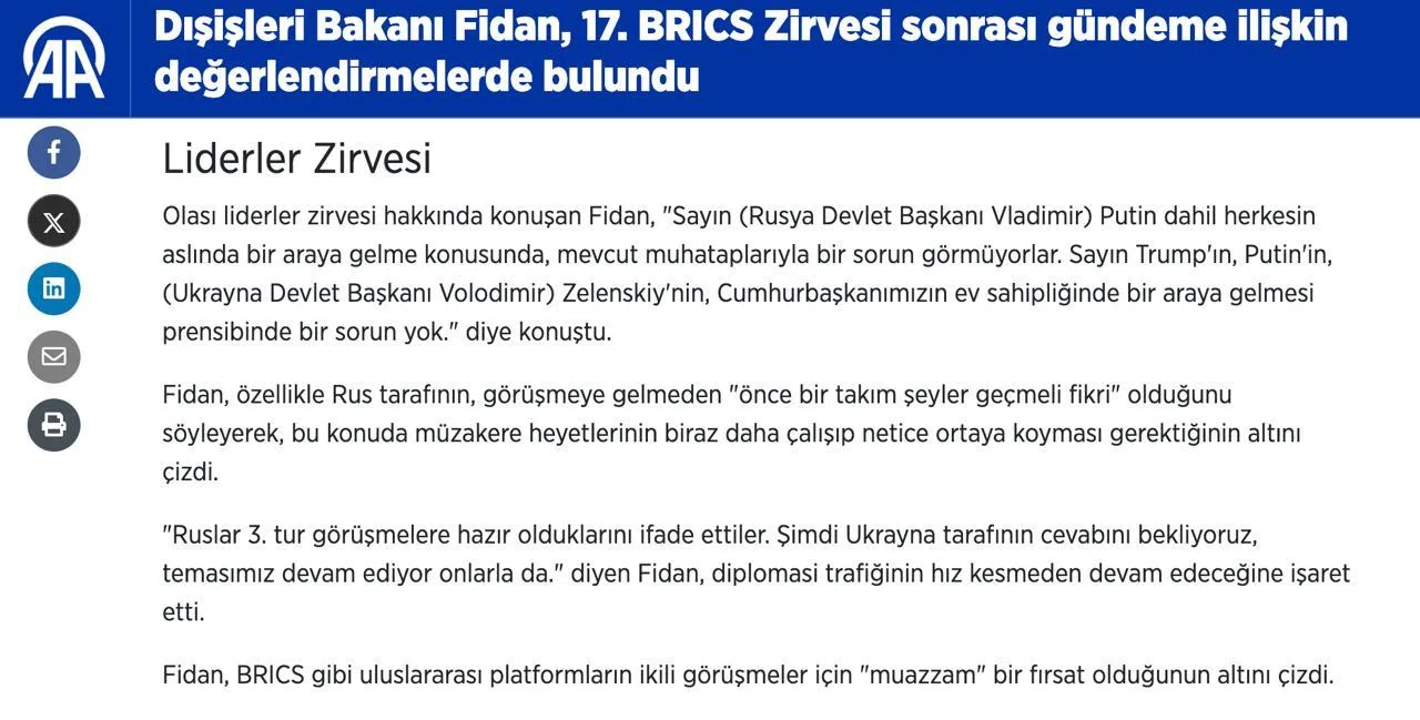 Москва подтвердила готовность к третьему раунду переговоров с Киевом, сообщил глава МИД Турции Хакан Фидан по итогам саммита БРИКС. По его словам, Россия передала соответствующий сигнал, и теперь Анкара ожидает ответ от Украины.