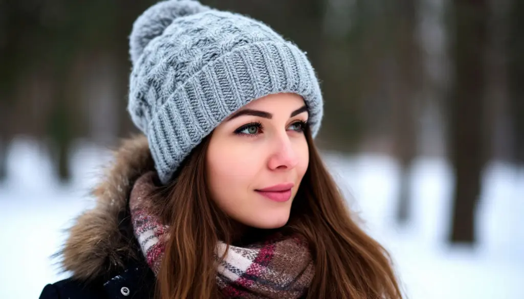 Обратите внимание на шапку-бини средней плотности. Ее мягкий объем на вершине головы визуально смягчает черты лица. Пастельные тона, такие как лавандовый, нежно-серый или персиковый, действуют как светоотражатель, придавая лицу свежесть.