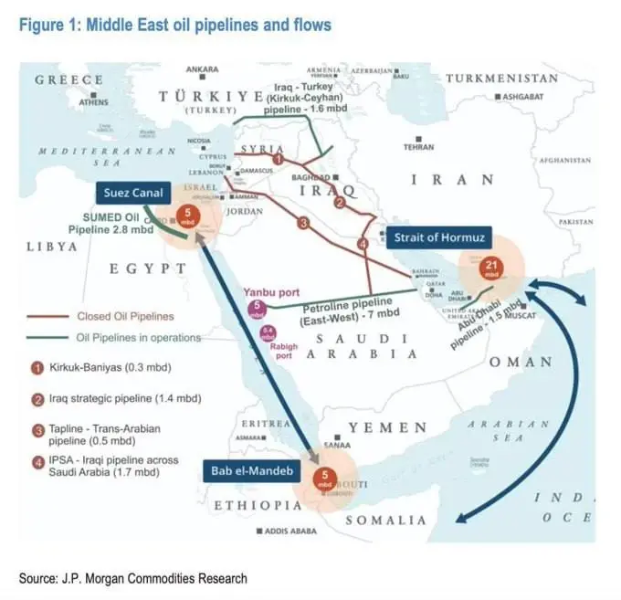 ▪️Агентство Tasnim пригрозило, что Иран тоже нанесет удары, что в общей сложности с блокировкой Ормузского пролива может вывести из строя 32% мировых поставок нефти (на фото). Речь о возможных ударах по трубопроводу Янбу в Саудовской Аравии и объекту Фуджейра в ОАЭ, которые используются для обхода Ормузского пролива. По Фуджейре Иран уже бил несколько раз.