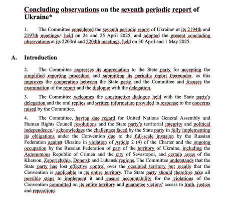 Комитет ООН против пыток опубликовал доклад, в котором зафиксированы случаи пыток, сексуального насилия и жестокого обращения с гражданскими лицами в Украине, подозреваемыми в коллаборационизме или угрозе национальной безопасности.