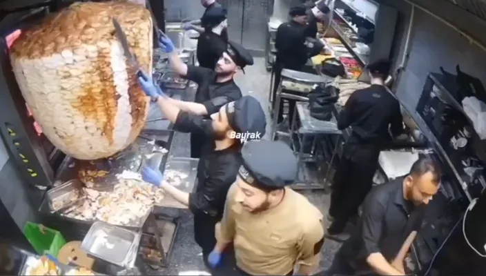 Вес конструкции примерно 500 кг. Вертел упал во время нарезки мяса.