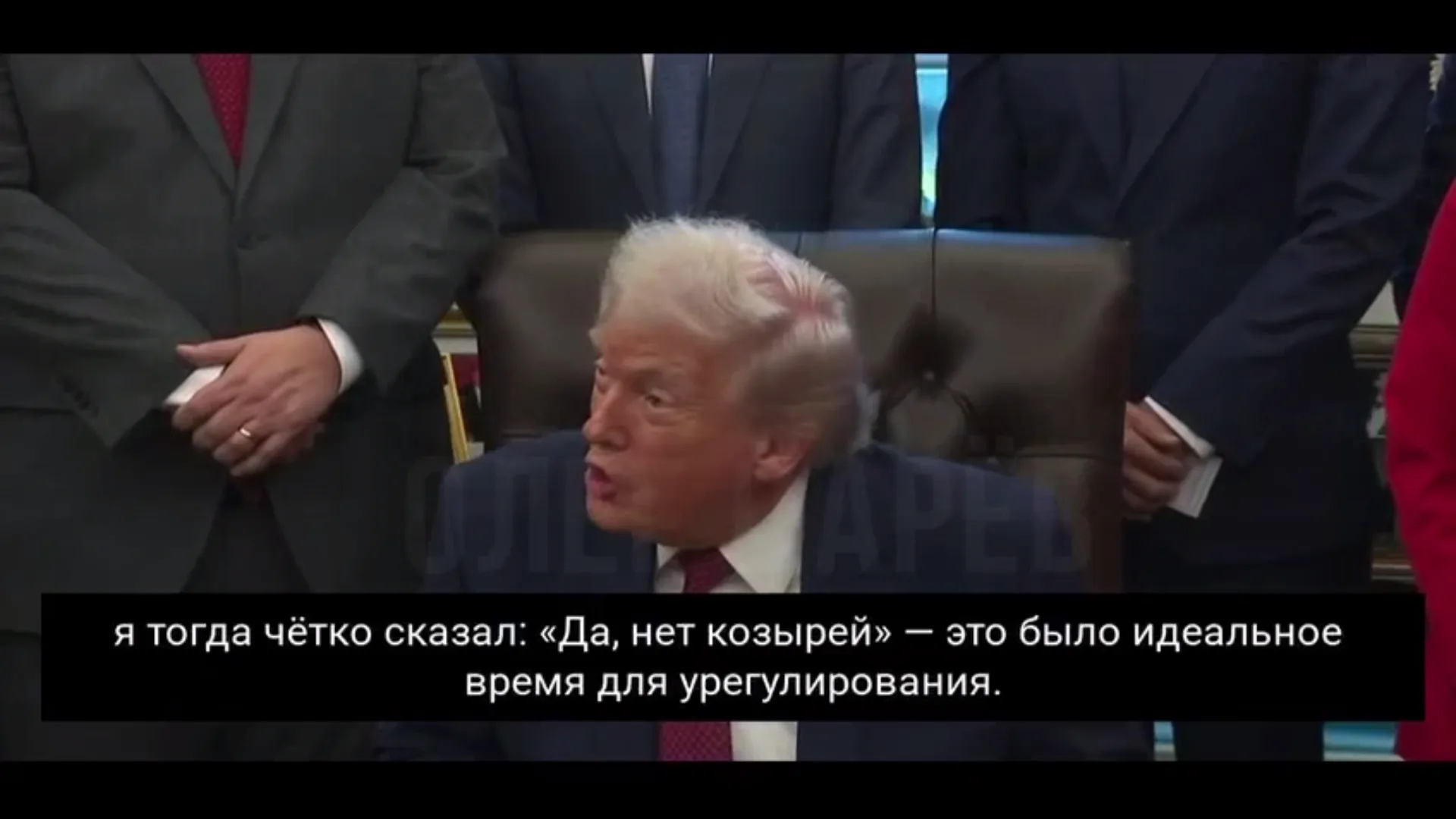 «Прямо здесь, в этом кабинете, я говорил Зеленскому, что у него нет карт. Вот тогда и нужно было договариваться. Я считал, что это было бы намного лучшее время для договоренности. Но «мудрецы» решили этого не делать. Сейчас все против них», – сказал американский президент.