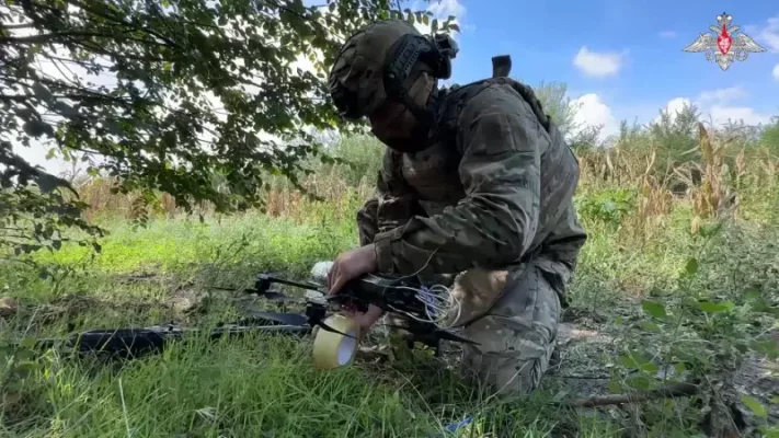 Военнослужащие работают парой. Первый номер готовит ударный дрон к запуску, а второй производит разведку с помощью квадрокоптера. После запуска FPV-дрона второй номер корректирует полет ударного БпЛА для точного наведения на цель.