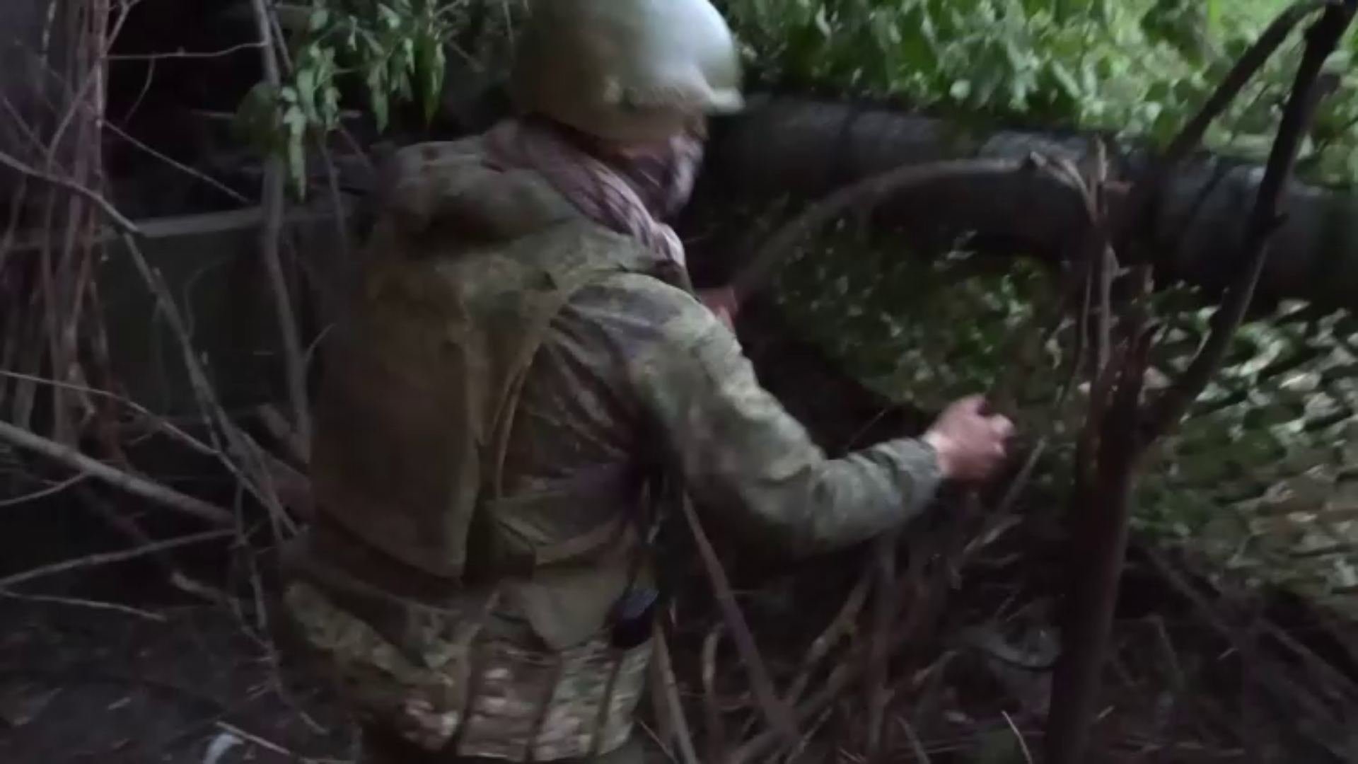 На кадрах вечерняя работа быстро приходит в ночную. Когда наступают сумерки, солнце здесь садится очень быстро. И тут вступает в силу новые правила работы. После нескольких выстрелов бойцы обязательно уходят в укрытие. Вспышки орудия в темноте видны отчётливо и противник может обнаружить гаубицу.