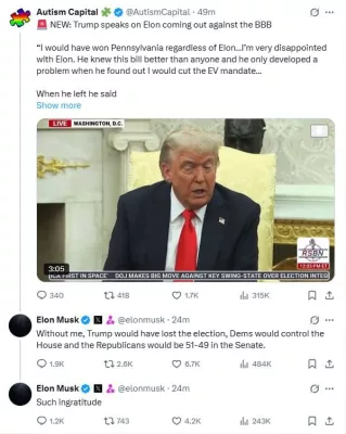 Маск в течение дня продолжал критиковать законопроект Трампа о налогах и расходах, который президент США уже подписал.