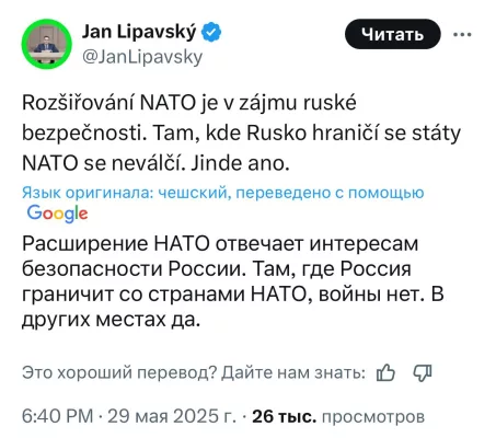 «Расширение НАТО соответствует интересам безопасности России. Там, где Россия граничит со странами НАТО, война не ведется, а в других регионах — ведется», — написал он.