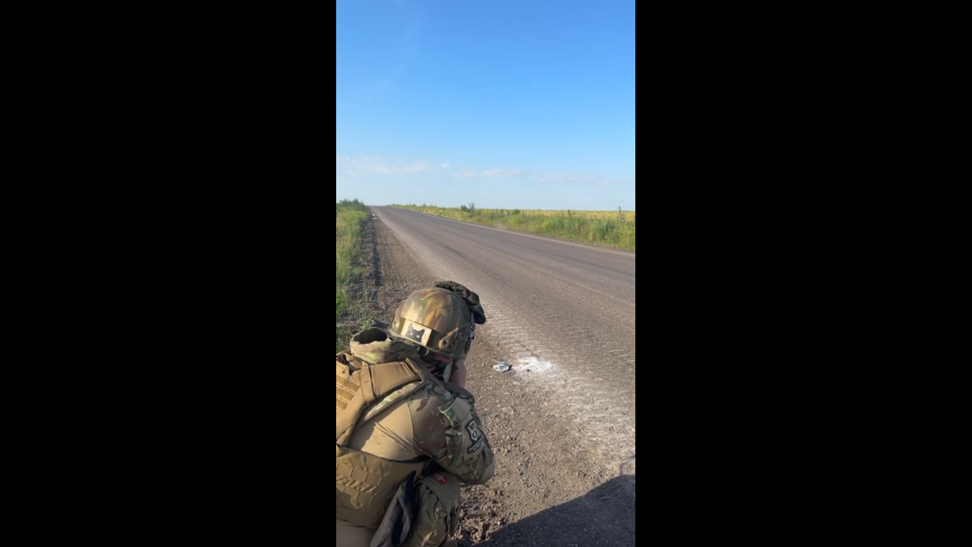 Точным выстрелом российский боец взрывает мину DM1399 (Deutsche Modellbezeichhnung 1399).