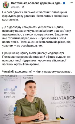 ✖️ Кроме того, 22 августа военная администрация Полтавы в соцсетях сама сообщила, что на базе одной из воинских частей формируется и обучается целая рота операторов БПЛА.