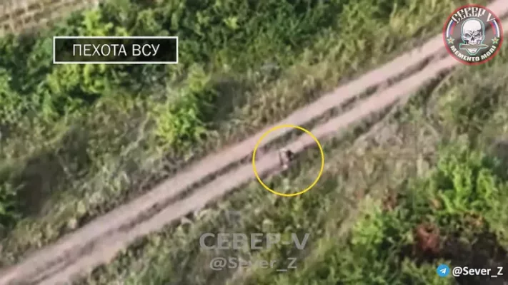 Один из бойцов попытался укрыться от преследования среди деревьев, но это не помогло. На кадрах видно тяжёлое ранение противника.