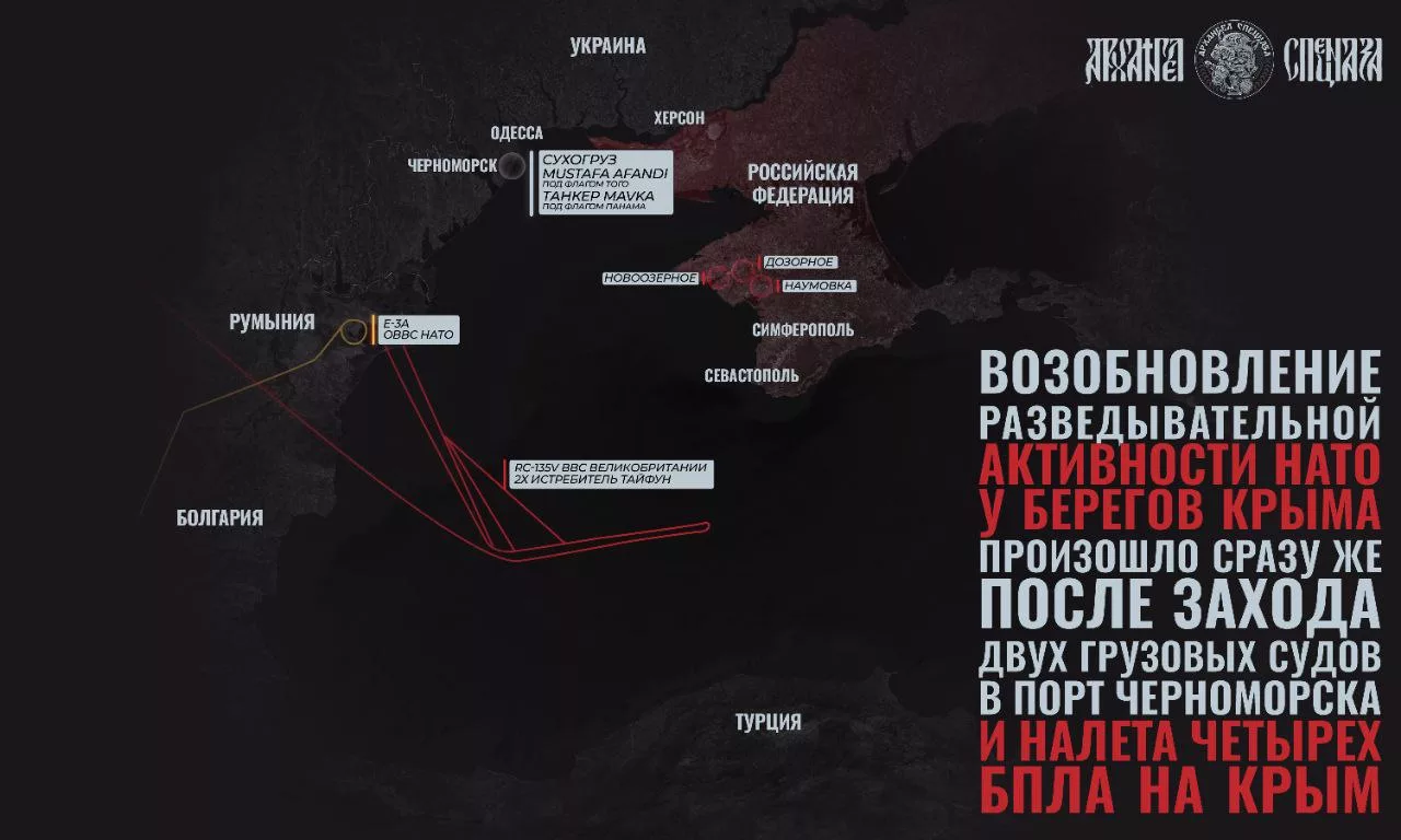 - RC-135 пролетел до центральной части моря, пропатрулировал к юго-западу от Крыма и Севастополя, после развернулся и убыл в обратном направлении.