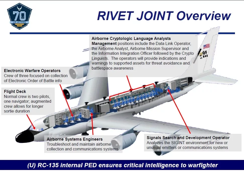 Разведчики между собой отличаются по задачам, есть машины, следящие за ядерной безопасностью и ракетными учениям, но мы остановимся на RC-135V/W Rivet Joint. Главное здесь бортовая техника — всевозможная радиоэлектронная аппаратура, предназначенная для обработки радиосигналов во всех диапазонах. Электроника обрабатывает все источники радиосигналов (системы ПВО, радары и радиосвязь, данные от бортовых РЛС и средств обнаружения) выводя их на карту, а офицеры-разведки (обычно со знанием 2-3 языков) обрабатывают переговоры противника в режиме реального времени. Заявлено, что электроники хватает для работы с вражескими голосами и сигналами на дистанциях до 900 километров. При этом обмен с коллегами по вооруженным силам США этими данными ведется по спутнику и в рамках тактических систем. Поскольку сразу пишутся координаты радиоизлучающих целей, есть возможность выдавать целеуказание в режиме реального времени для доразведки или уничтожения целей. В любом случае самолет встроен в единую систему передачи данных НАТО Link-16. С этой же системой работают и японцы, если вдруг речь идет о работе на Тихом океане.
