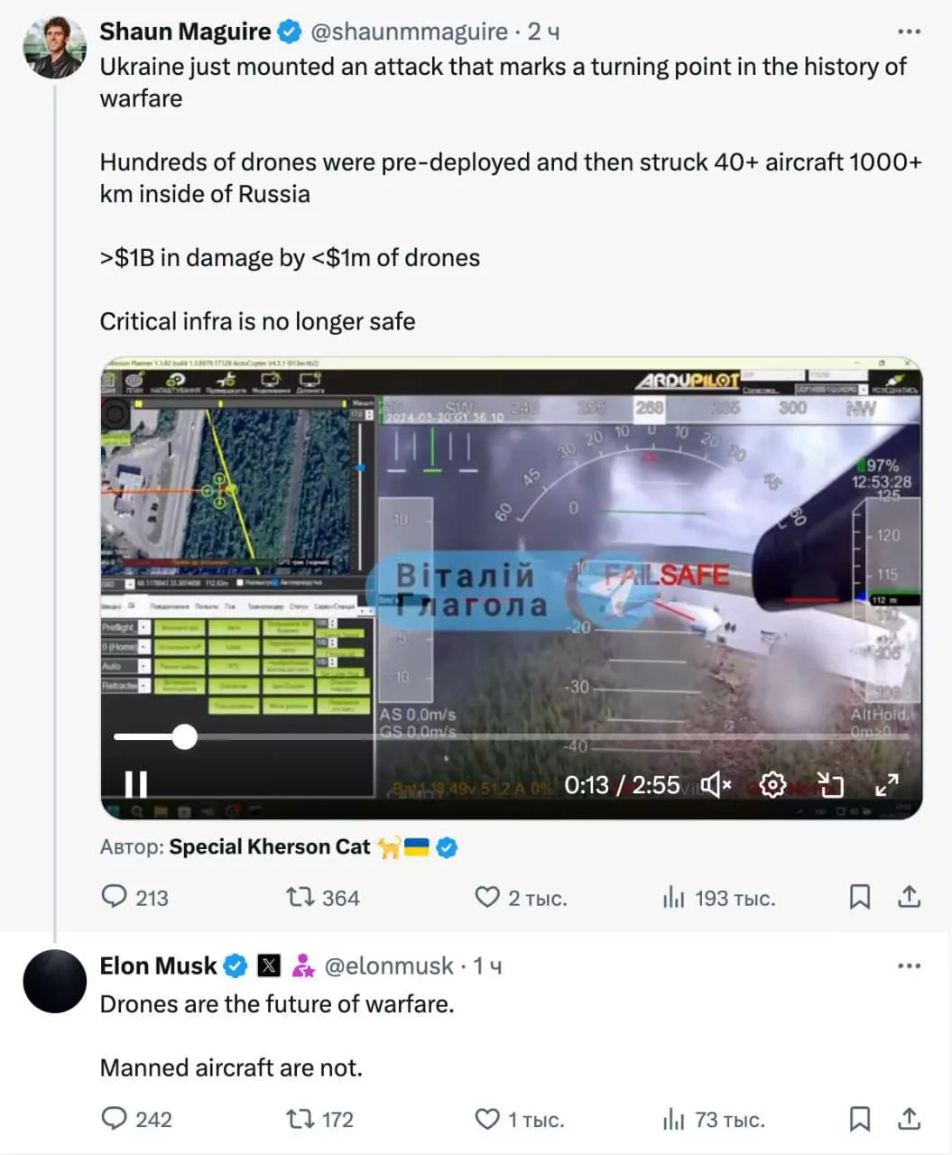 - Илон Маск оценивал произошедшее с технологической точки зрения и отметил эффективность использования Украиной БПЛА: «Дроны это будущее войны. Пилотируемая авиация — уже нет».