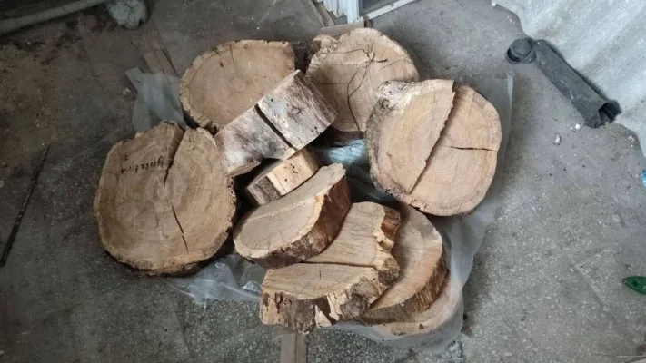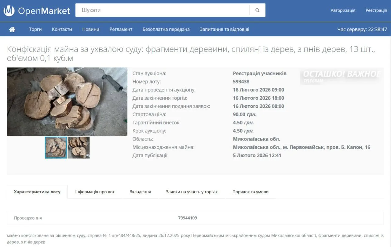 - Стартовая цена ₴90. Лот обозначен как «срубленные фрагменты древесины 13 шт» 0,1 м³.