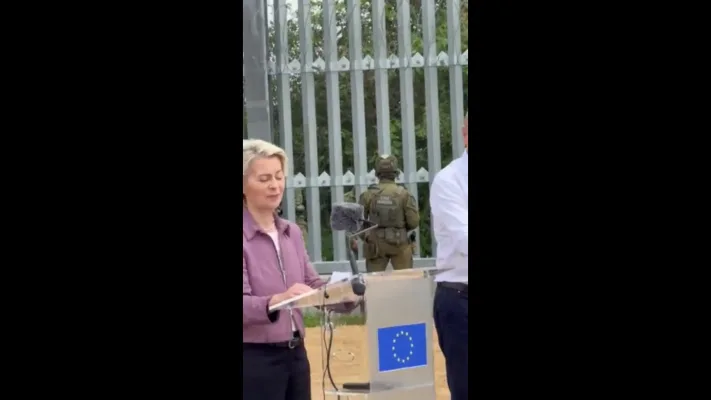 - Глава Еврокомиссии Урсула фон дер Ляйен посетила Польшу и вместе с премьер-министром Дональдом Туском решила обратиться… к белорусским пограничникам. Для этого площадкой выбрали пятиметровый забор на границе, с другой стороны которого и стояли военнослужащие.