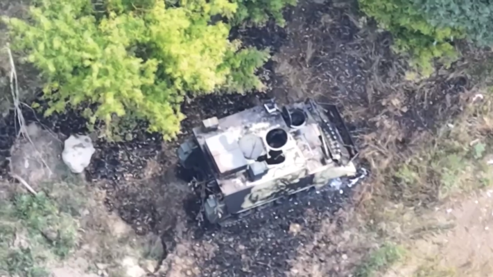 Редкая американская КШМ М577 (на базе M113) и бронеавтомобиль Козак-7 украинской армии, уничтоженные возле переправы через реку Крепна восточнее Коренево, Курская область.