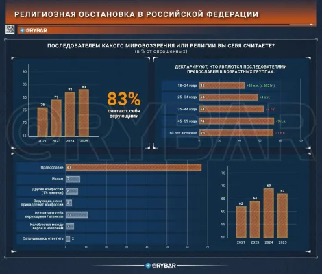 - Доля православных растет, причём наиболее значимая динамика наблюдается среди младшей молодёжи (18-24 года). За последние годы доля молодых людей этого возраста, которые считают себя православными, выросла практически в два раза — с 25% до 45%.