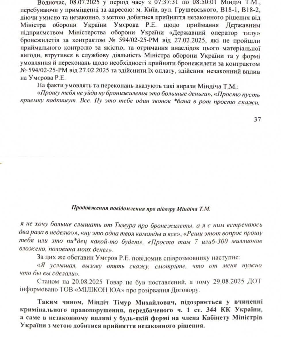 «Прошу тебя не уйди ну бронежилеты это большие деньги», «Просто пусть приемку подпишут. Все. Ну это тебе один звонок *бана в рот просто скажи, я не хочу больше слышать от Тимура про бронежилеты, а я с ним встречаюсь два раза в неделю», «ну это одна твоя команды и все», «Реши этот вопрос прошу тебя или это пи*дец какой-то будет», «Просто там 7 или 6-300 миллионов вложено, половина моих денег», – писал Миндич.