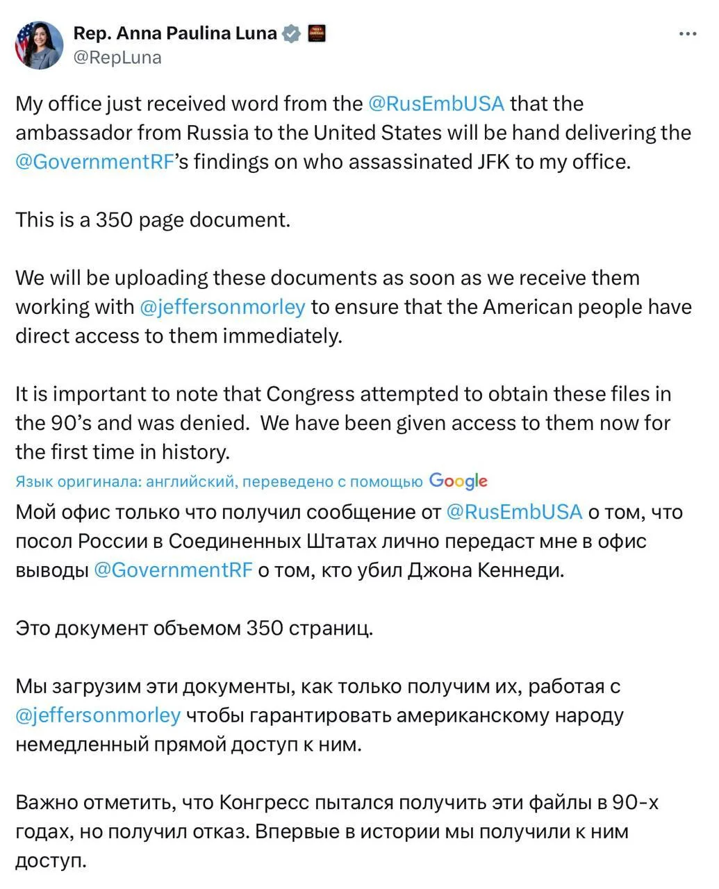 Россия передала США 350-страничный отчет с рассекреченными советскими материалами об убийстве Джона Кеннеди. Документы получилa конгрессвумен Анна Паулина Луна – и назвала этот шаг «примером исторического сотрудничества между двумя странами».