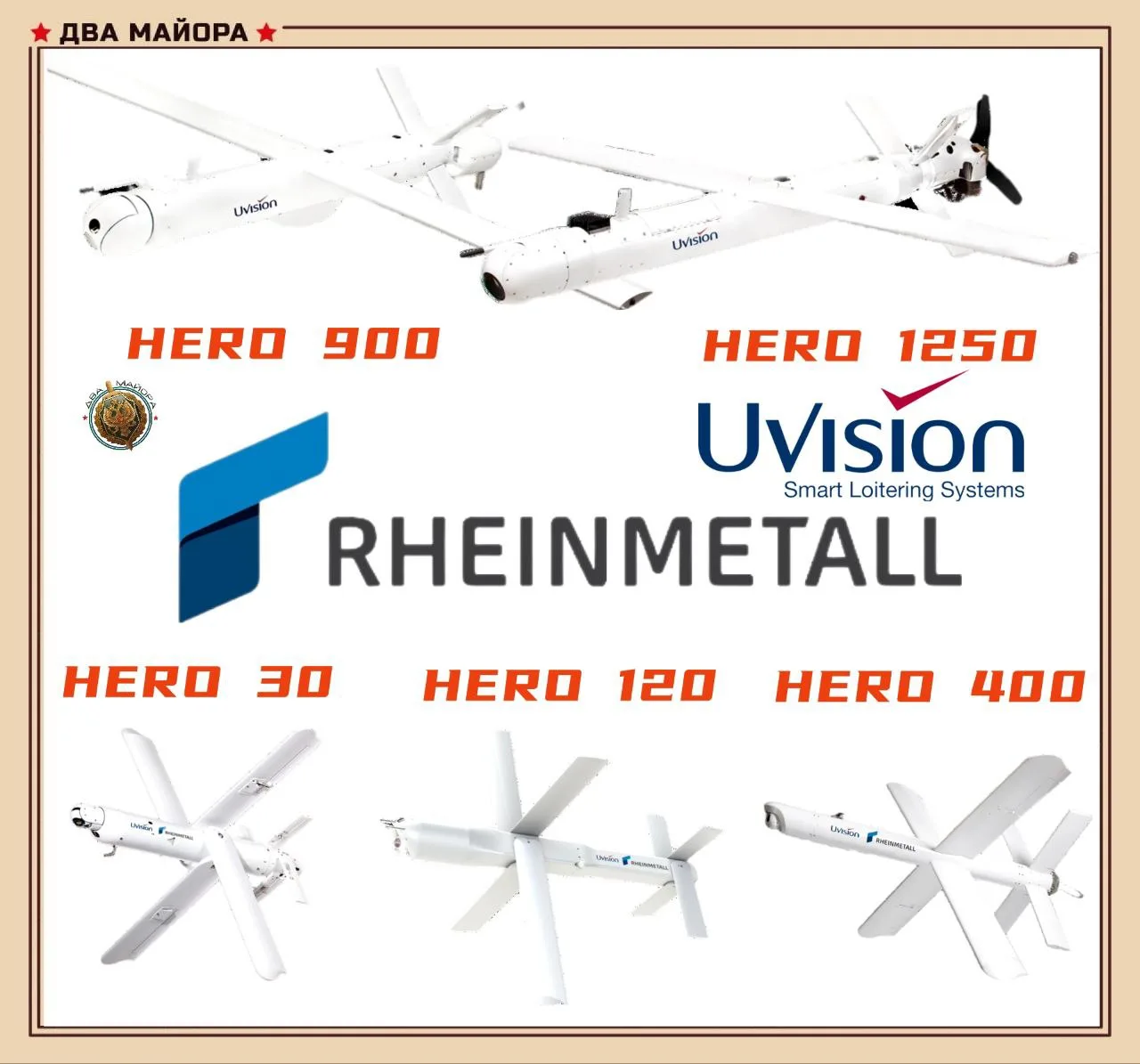 ◾а также перспективные HERO 900 (вес 90 кг, БЧ — 25 кг, дальность 150 км) и HERO 1250 (вес 125 кг, БЧ – 50 кг, дальность 200 км).
