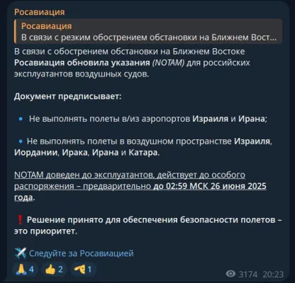- Также Росавиация приостанавливает полеты в воздушном пространстве Израиля, Иордании, Ирака, Ирана и Катара.