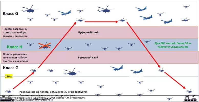 Это красиво смотрится на картинке, если не задаваться вопросом: как же взлетающие дроны будут пересекать «нижний» пилотируемый слой 0-300м, и как вся авиация будет снижаться ниже 400м через «дроновый» слой на посадку, без которой самолеты и вертолеты обходиться еще не научились?
